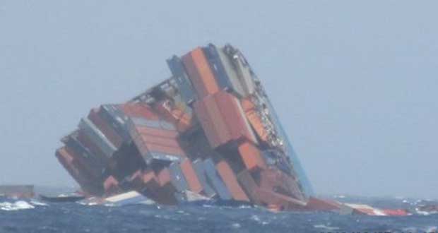 Un navire sombre dans l'océan indien avec des milliers de conteneurs