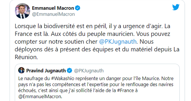 Naufrage du Wakashio: Emmanuel Macron répond au tweet de Pravind Jugnauth