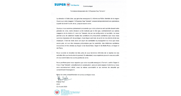 Distanciation sociale: Super U met Tamarin en veilleuse temporairement