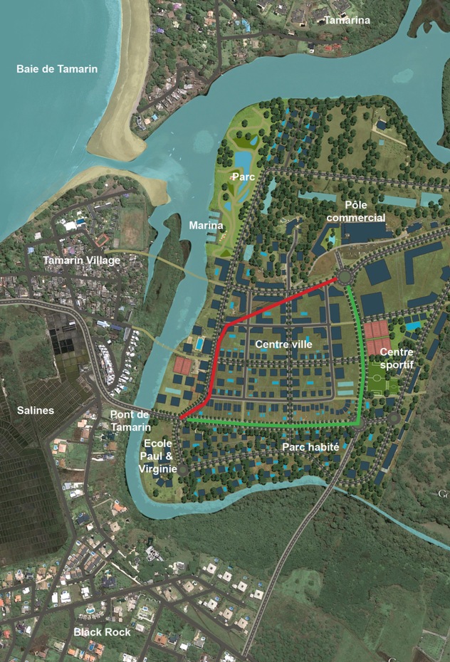 Le plan de Cap Tamarin tel qu’imaginé par les frères Jhuboo. En rouge, le tracé de l’ancienne route nationale, et en vert la future route.
