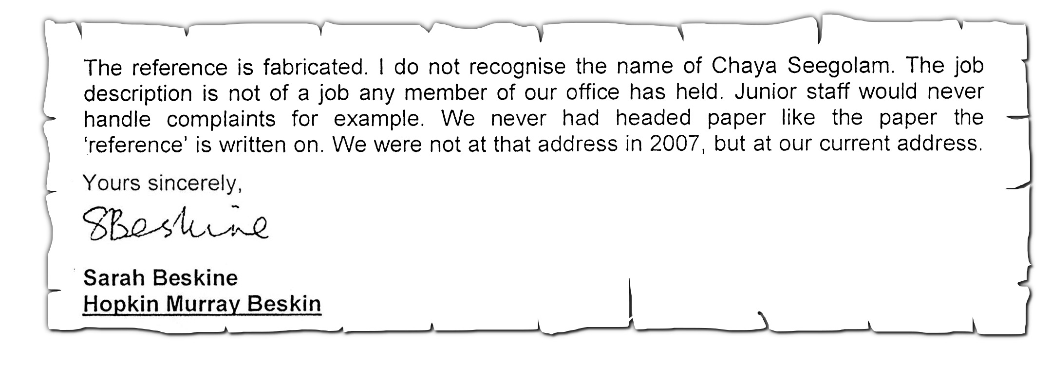 «The reference is fabricated. I do not recognise the name of Chaya Seegolam.» C’est ce qu’a indiqué Sarah Beskine, un des membres fondateurs du cabinet d’avocats Hopkin Murray Beskine, dans une lettre datée du 15 mai et adressée au directeur de laTEC, Ashok Kumar Bakhshi. Elle précise que le Job Description qui figure dans la référence n’existe pas dans son cabinet, que l’en-tête utilisé n’est pas le sien et que l’adresse affichée est incorrecte.