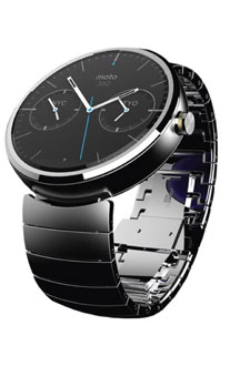 Présentée comme la smartwatch la plus complète, la Moto 360 est un sérieux concurrent sur ce segment de la téléphonie d’extension. La Moto 360 se présente donc comme une montre à écran tactile LCD. Mais le rendu de l’image laisse perplexe. Son boîtier est en acier inoxydable, certifié IP67 (étanche jusqu’à 1 m pendant 30 minutes) et intègre une puce mobile Texas Instrument OMAP 3 accompagnée d’une mémoire vive de 512 Mo et d’une capacité de stockage de 4 Go. Un cardio-fréquence mètre optique se loge au dos du boîtier. Au contact dupoignet, le chargement se fait par induction. La batterie atteint une capacité de 320 mAh. Fonctionnant avec l’assistant Google Now, la montre se connecte aux smartphones pour prendre connaissance des notifications. Android Wear permet d ’ avoir accès à des applis et aussi de répondre aux SMS via des commandes vocales. Disponible chez One.O.One