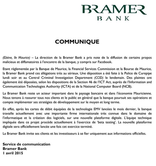 Toujours le 1er avril : un autre post sur Facebook: “Bramer Banking Corporation Ltd has taken note of a highly defamatory statement posted on the Facebook community by identified individuals and the subsequent sharing and comments made by a group of persons to the Public. Such malicious comments constitute a criminal offence under the ICT Act and other laws of Mauritius and the Bank is taking all necessary steps to report the matter to the authorities for prompt action.”