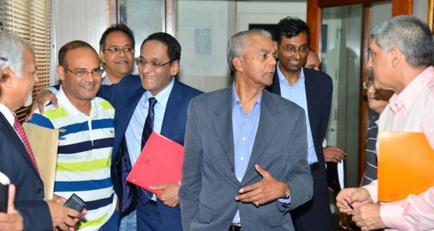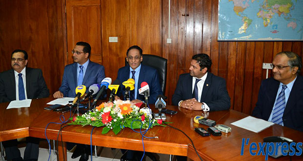 15h55 : Aux côtés de Vishnu Lutchmeenaraidoo: le gouverneur de la Banque centrale, Ramesh Basant Roi, ainsi que les deux conservateurs, André Bonieux et Mushtaq Oosman. Mais également les directeurs de Bramer et de la BAI, Ashraj Esmael et Rishi Sookdawoor.