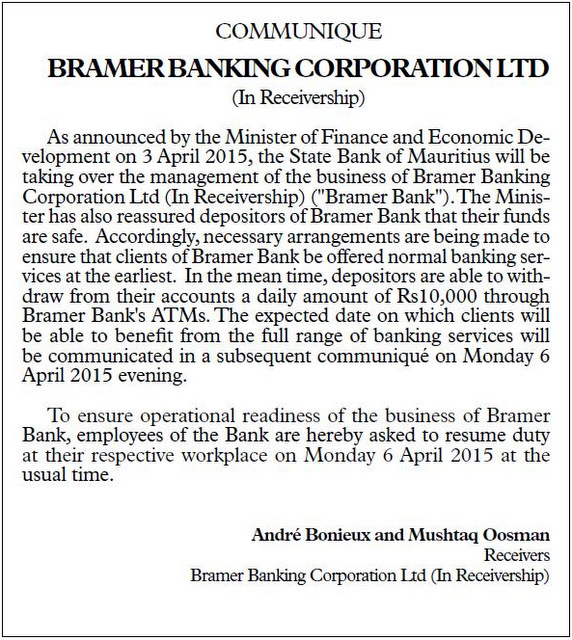 Le coup de grâce a été donné à 00 h 45, vendredi 3 avril. Dans un communiqué, la Banque de Maurice  indique que le permis d’opération de la Bramer Bank est suspendu pour non-respect des pratiques bancaires, entre autres. Suivez en fil rouge les derniers développements dans cette affaire…