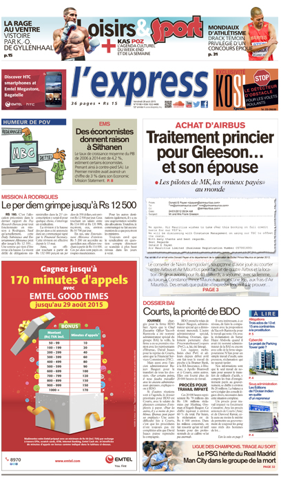 Le conseiller de Navin Ramgoolam, soupçonné d’avoir joué au courtier entre Airbus et Air Mauritius pour l’achat de quatre Airbus et la location de deux avions pour Rs 41 milliards, a séjourné, avec sa femme, au luxueux Constance Prince Maurice au moins une fois, aux frais d’Air Mauritius. Des emails que publie l’express tendent à le prouver…