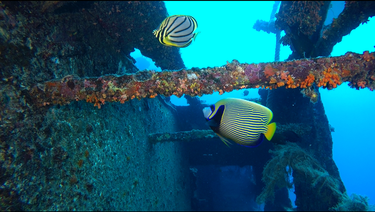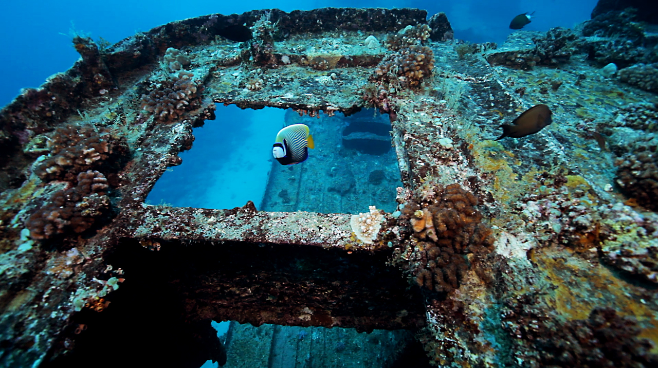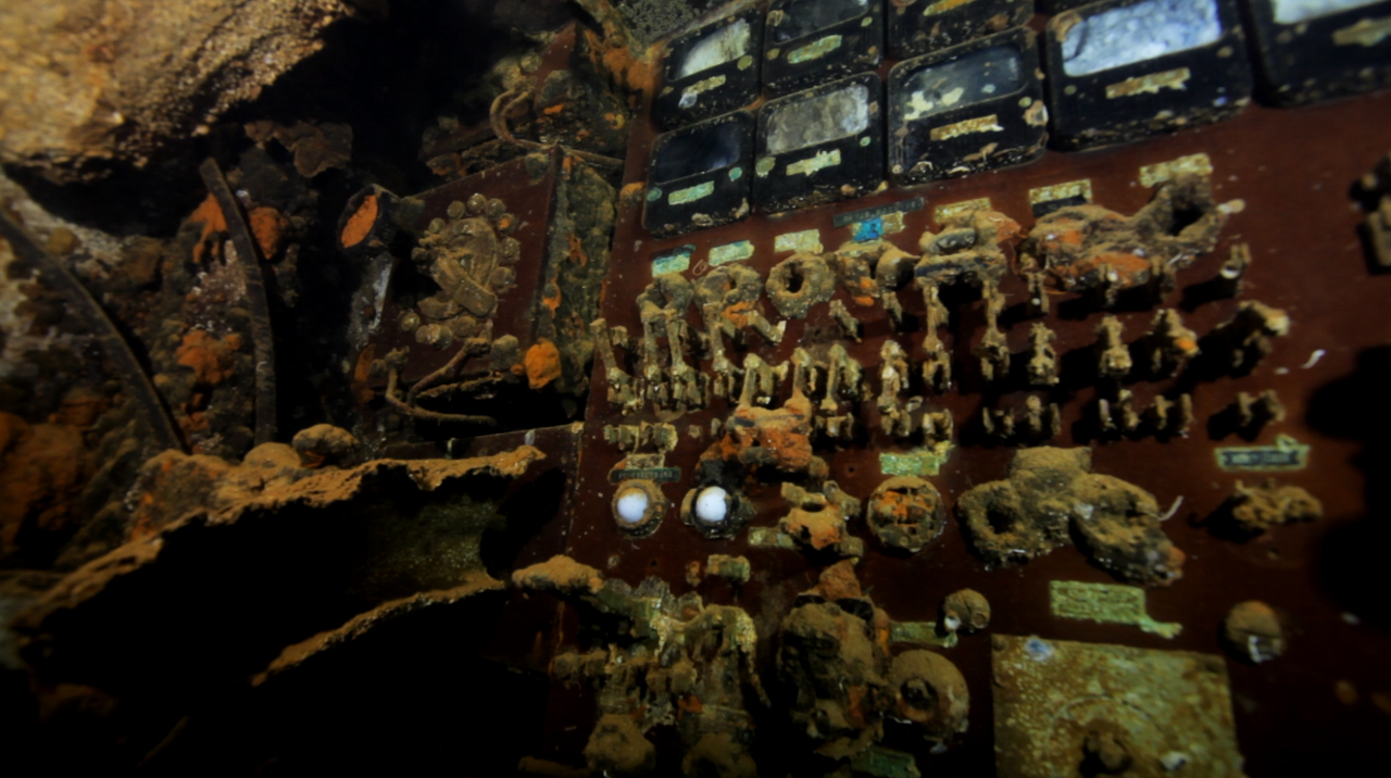 A l’intérieur du navire, on a l’impression de découvrir un site archéologique merveilleusement préservé. Sur la passerelle, le tableau de bord est encore présent, recouvert d’algues calcaires et en partie rongé par l’iode. Cependant, on lit toujours les instructions et marques de chaque bouton, de chaque manette. Dans les parois, le temps aura formé des trous qui s’ouvrent sur le grand bleu comme des fenêtres où passent librement les poissons-soldats résidents.