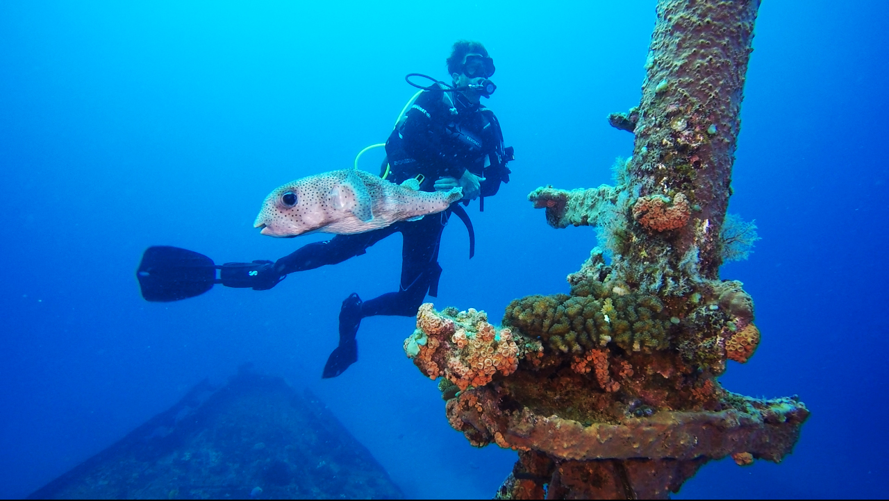 Près de trente ans plus tard, l’épave regorge encore de vie. Quelques murènes javanaises y résident, trouvant leur bonheur dans les nombreuses crevasses et bouches d’aération de l’ancien navire. Sur le pont, un poisson-ange empereur affiche ses magnifiques rayures jaune et bleu. Gardez les yeux ouverts, car des juvéniles pourraient se cacher non loin. Mais attention : au lieu de rayures, ceux-ci sont bleus et marqués de cercles concentriques jaunes. Plus haut, un diodon – plus connu sous le nom Bouletangue à Maurice – fait le guet autour du mât, calme et peu farouche. Sous la coque du bateau, des rascasses volantes (Laffes volants) se camouflent parmi les algues calcifiées pour profiter d’un moment de repos. Approchez-vous, mais surtout ne les touchez pas ! Les laffes font partie de la famille des Scorpaenidae, aux rayons dorsaux venimeux. Cependant, ils ne sont pas de nature agressive et s’entendent à merveille avec les plongeurs.
