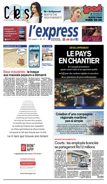 L’express consacre sa Une aux projets de développement élaborés par l’État. Un comité public-privé s’est réuni hier pour faciliter leur concrétisation. Autres titres en Une : La création d'une compagnie régionale maritime, la traque aux mauvais payeurs a démarré pour les détenteurs de baux de l’État, et les employés limogés de Courts qui se partageront la somme de Rs 12 millions.