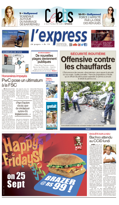 L’express consacre sa Une aux mesures «draconiennes» annoncées par l’État pour assurer la sécurité sur nos routes. Autres titres en Une : «Honoraires impayés : PwC pose un ultimatum à la FSC», «Enquête sur la NDU : Bachoo au CCID lundi».
