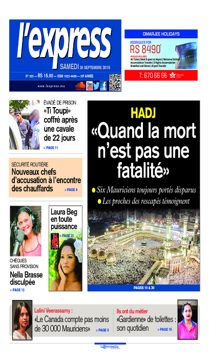 L’express consacre sa Une au Hadj et à la bousculade meurtrière survenue à La Mecque. Les proches des rescapés mauriciens témoignent. Autres titres: de nouveaux chefs d’accusation en préparation à l’encontre des chauffards et l’ancienne animatrice Nella Brasse, mise en cause dans une affaire de chèques sans provision, a été disculpée.