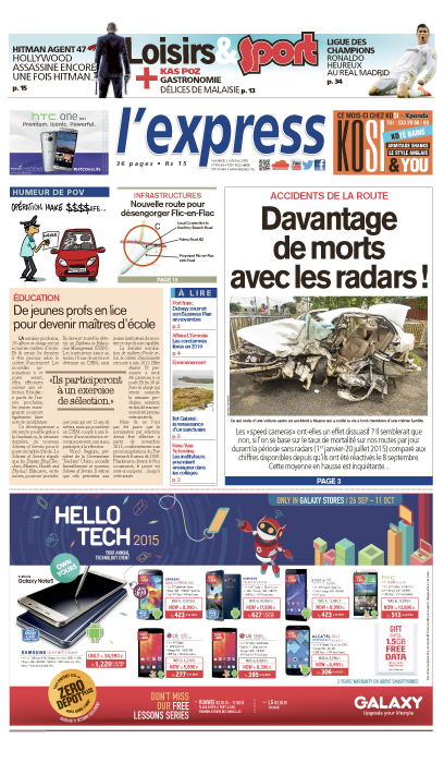 En une de l’express de ce vendredi 2 octobre : Accidents de la route : davantage de morts avec les radars. Autres titres en une «Education : de jeunes instituteurs en lice pour devenir maîtres d’école»,  «Port franc : Dubayy soumet son Business Plan en novembre», «Ilot-Gabriel : la renaissance d’un sanctuaire».