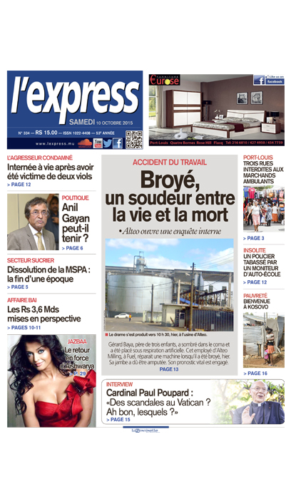 À la Une de l’express: un soudeur, victime d’un accident sur son lieu de travail alors qu’il tentait de réparer une machine défectueuse, est entre la vie et la mort. Autres titres: Anil Gayan est l’objet de tirs groupés depuis six mois, une handicapée internée à vie après avoir été victime de deux viols, et trois rues de la capitale sont interdites aux marchands ambulants.