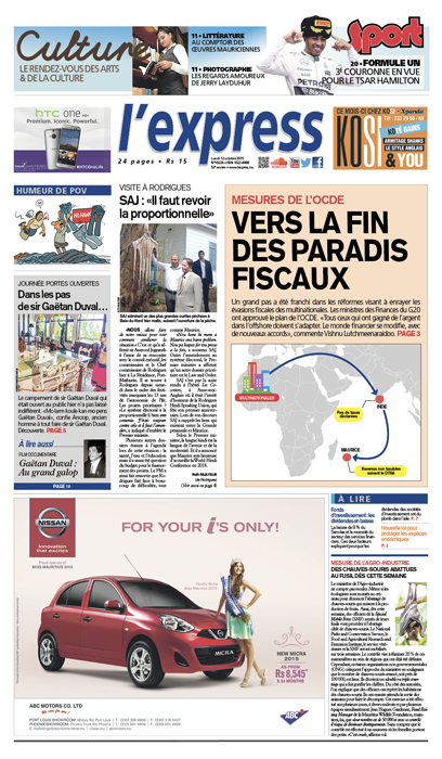 L’express consacre sa une aux mesures de l’OCDE, soit aux réformes visant à enrailler les évasions fiscales. Autres titres en une : SAJ à Rodrigues : «Il faut revoir la proportionnelle», «Journée portes ouvertes : dans les pas de sir Gaëtan Duval», «Des chauves-souris abattues au fusil dès cette semaine».