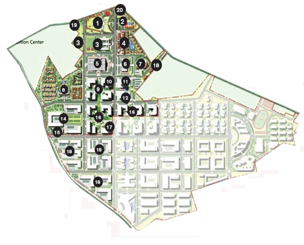 Incubation Centre et rue commerçante : YIHE décline aussi sa smart city par un volet entrepreneur et une ruelle commerçante. PME et autres compagnies privées pourront s’y implanter. Le maître-mot est le commerce. Bureaux et appartements sont prévus pour les entrepreneurs. Les tables des restaurants seront installées en plein air. Un total de 26 000 m2 y sera alloué.