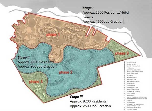 Le projet sera élaboré en trois phases. Au total, il devrait générer environ 7 900 emplois et constituer une zone habitable avec 13 000 résidents.