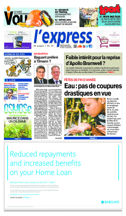 En Une de l’express: pas de coupures drastiques d’eau en vue pour les fêtes de fin d’année. Les réservoirs affichent un taux de remplissage moyen de 80%. Autres titres: les deux noms les plus cités pour le poste de CEO de MK sont ceux de Sushil Baguant et de l’Allemand Gabriel Tilmann, Veekram Bhunjun a été admis en clinique et un projet d’échoppes à Trou-aux-Cerfs fait des vagues.
