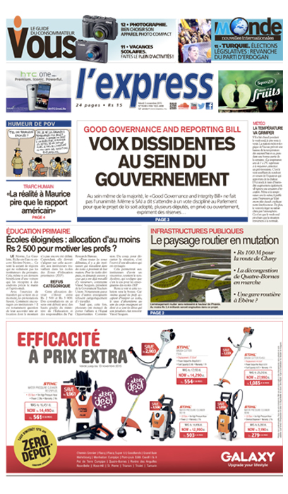 En Une de l’express, ce mardi 3 novembre: La polémique autour du Good Governance Bill enfle. Le projet de loi de Roshi Bhadain ne fait pas l’unanimité et cela, au sein même du gouvernement. Autres titres : Le paysage routier en mutation dans plusieurs régions de l'île et Écoles primaires éloignées: allocation d’au moins Rs 2 500 pour motiver les profs ?