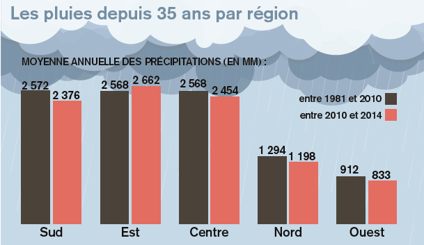 Depuis une bonne trentaine d’années, le sud et l’est de l’île reçoivent au moins autant de pluie que la région centrale, pourtant réputée pour être la plus humide. Moins surprenant : l’Ouest est de loin le territoire le plus sec. Il y pleut deux à trois fois moins qu’ailleurs.