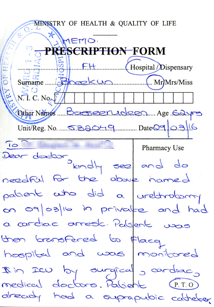 Buseerudin Beekhun souffrait depuis deux ans du rétrécissement de l’urètre (il ne pouvait plus uriner normalement et avait été équipé depuis deux ans d’une sonde qu’il avait toujours sur lui). «Il était résigné à garder cette sonde car, à cause de ses antécédents cardiaques, tous les urologues que nous avons vus ont toujours refusé de lui faire cette opération. Mais le Dr Fakim a assuré pouvoir le faire sans risque», raconte Arshad, fils du défunt.