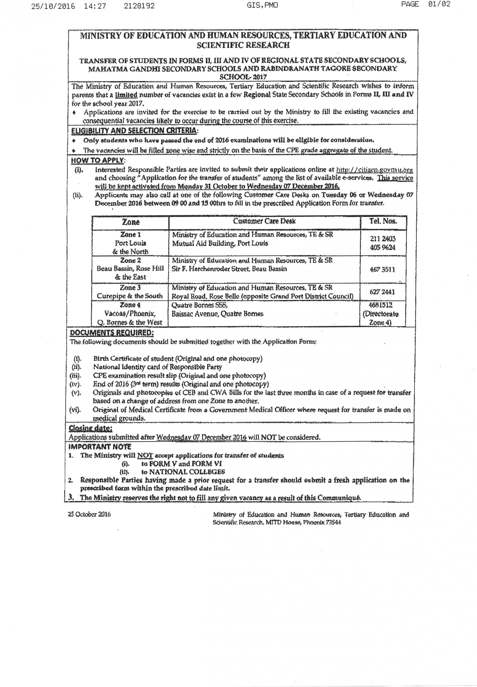 Les parents souhaitant faire transférer leurs enfants dans un collège d’État pourront, dès le lundi 31 octobre, faire leur demande. Ceci concerne les élèves qui souhaiteraient être admis en Forms II, III et IV. Les seules places disponibles se trouvent dans des collèges régionaux de l’île, au Mahatma Gandhi Institute et au Rabindranath Tagore Secondary Schools.