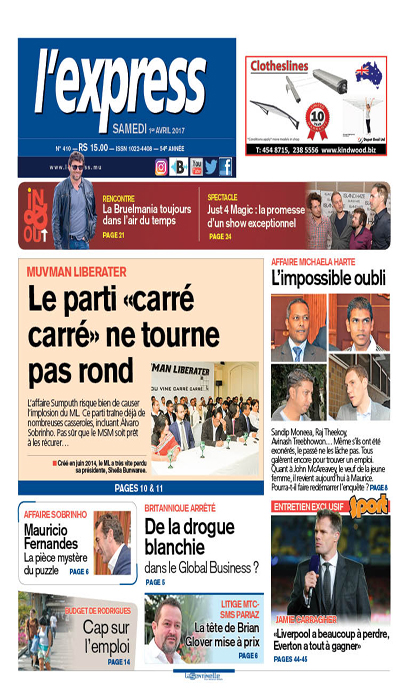 En une : Muvman Liberater, le parti «carré carré» ne tourne pas rond. Autres titres : de la drogue blanchie dans le Global Business ? Et affaire Michaela Harte : l'impossible oubli.