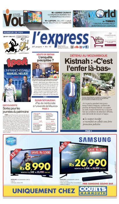 En une : Détenu au Mozambique : «C’est l’enfer là-bas», avoue Kistnah. Autres titres : Sortez pour les journées du patrimoine et l’enquête sur la vente de Britam précipitée ?