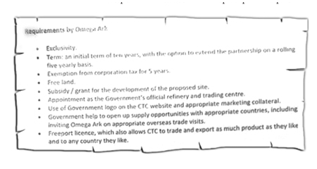 <p>«L’express» est en possession d’une proposition faite au Board of Investment (BOI) par Omega Ark, en août 2016. La compagnie n’avait toujours pas effectué le paiement de la vente d’Apollo Bramwell. Omega Ark aspirait, en effet, à devenir l’opérateur d’un <em>«Refinery and Commodity Trading Centre (CTC)»</em>. La création d’une compagnie visant à exploiter les possibilités de raffinage de l’or était envisagée et un site à proximité de l’aéroport avait déjà été ciblé, selon la proposition faite au BOI. Toutefois, la proposition a été rejetée par le BOI. Le directeur général, Ken Poonoosamy, explique que la proposition de la société britannique «n’était pas recevable» en se basant sur les conditions d’Omega Ark. En effet, l’une des principales exigences de la compagnie était d’avoir une exclusivité. «<em>Ce n’était pas possible pour nous, au niveau du BOI, n’approuver cette proposition</em>.» D’autant plus qu’Omega Ark n’a pu produire des «proof of funds» comme demandé par le BOI.</p>