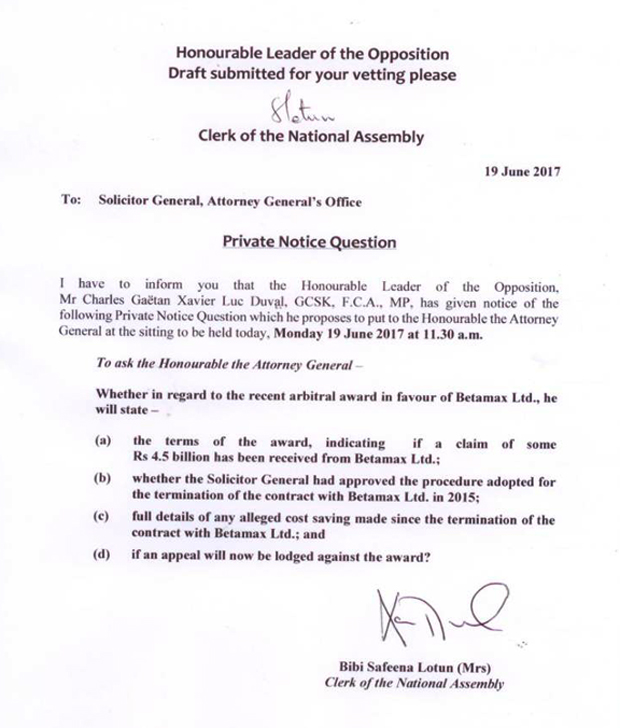Lors de sa PNQ, Xavier-Luc Duval demandera à Ravi Yerrigadoo si après la décision en faveur de Betamax Ltd, ce dernier peut indiquer si une réclamation de Rs 4,5 milliards a été reçue de cette entreprise. Deuxièmement, la PNQ sera axée sur l’approbation du Solicitor General au niveau de la procédure adopté pour la résiliation du contrat de Betamax en 2015. Les détails des coûts économisés éventuellement suite à la fin du contrat de Betamax et la possibilité d’un appel logé contre la décision de l’arbitrage seront également à l’agenda de la question parlementaire.
