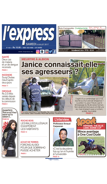 En une: La police tente de savoir si la victime du meurtre à Albion, Janice Farman, connaissait ses agresseurs. Autre titre: deux cas de malaria et un de dengue recensés.