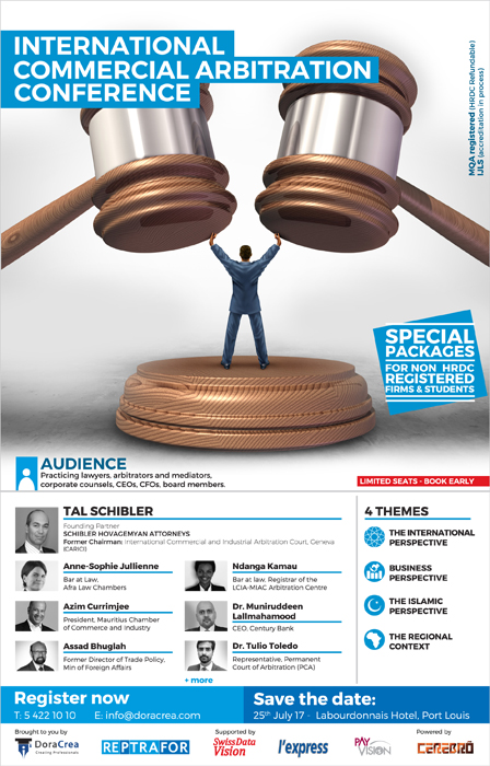 Cette conférence d’une journée réunira des conférenciers venant des entreprises et de la profession légale. Ils se pencheront sur le cadre légal mauricien et les perspectives que le pays compte développer pour se positionner comme centre d’arbitrage local et régional.