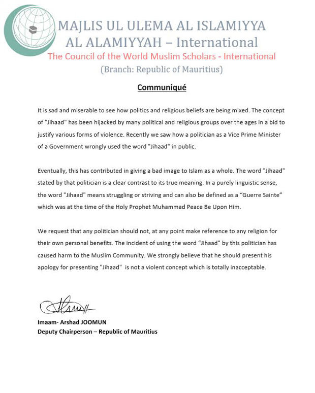 [Document] Utilisation du terme «jihad»: des érudits musulmans demandent à Soodhun de présenter des excuses