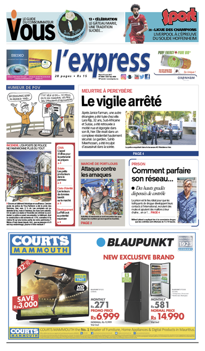 En une: le vigile de la luxueuse AO Résidence a été arrêté pour le meurtre de la Sud-Africaine à Pereybère. Autre titre: comment les trafiquants développent leur réseau de drogue en prison.