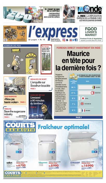 En une: Maurice est-il en tête de liste des pays pourvoyeurs d’investissements directs en Inde pour la dernière fois ? Autre titre: l’enquête sur les menaces de mort de Soodhun à l’encontre de Duval bouclée.
