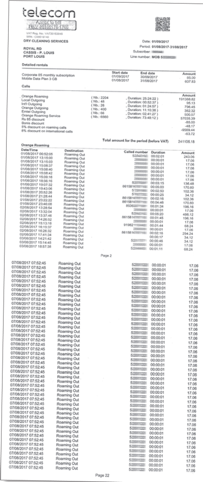 Rs 254 382. C’est le montant total de la facture – épaisse de 172 pages – de Mauritius Telecom du mois d’août 2017 de Sylvio Sundanum. L’ancien ami de Husein Abdool Rahim n’était pas à Maurice jusqu’au 7 août. L’utilisation de sa ligne de téléphone à l’étranger expliquerait ce montant. Au total 8 764 items apparaissent sous le service «roaming» et totalisent un montant total de Rs 248 424,21. Parmi eux, figure le numéro de Ravi Yerrigadoo à 3 337 reprises. L’ancien Attorney General apparaît 726 fois sous «Roaming Out» et 2 611 fois sous «Roaming Out Markup».