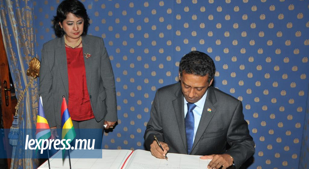 Lors de sa visite de courtoisie à la présidente de la République de Maurice, Danny Faure a signé dans le livre des visiteurs.