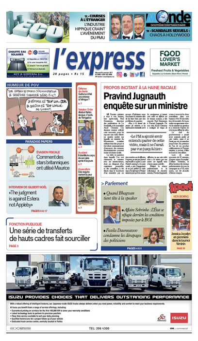 En une : Pravind Jugnauth enquête sur un ministre qui a tenu des propos incitant à la haine raciale. Autres titres : le transfert de hauts cadres de la fonction publique fait sourciller ou encore quand Bhagwan tient tête à la speaker au Parlement.
