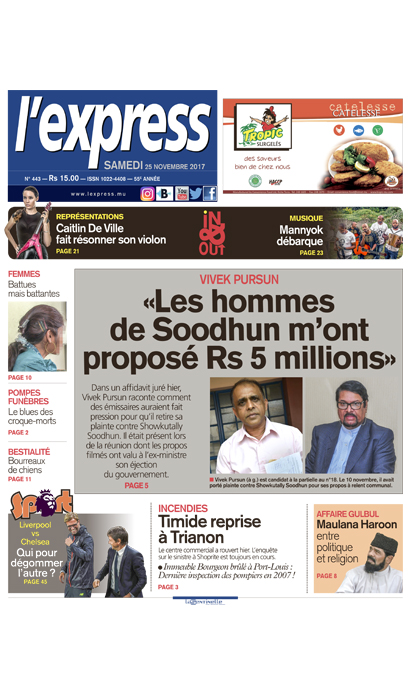 En une: «Les hommes de Soodhun m’ont proposé Rs 5 millions», dit Vivek Pursun. Autre titre: timide reprise au Trianon Shopping Park après l’incendie.