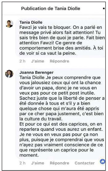 «Tania Diolle. Je peux comprendre que vous jalousiez ceux qui ont la chance d’avoir un papa, donc je ne vous en veux pas pour ce petit post inutile», réplique Joanna Bérenger. Dans le même commentaire, elle va plus loin en faisant allusion au fait que Tania Diolle n’ait pas d’enfants. «Pour ce qui est des caprices, on en reparlera quand vous aurez un enfant. Je comprendrai que vous n’ayez pas vraiment conscience de ce que représente un caprice pour le moment.»