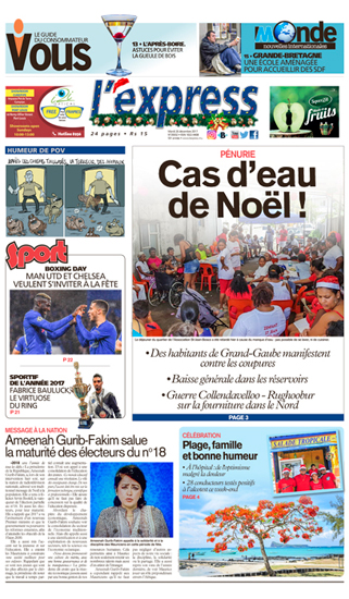 En une : Cas d’eau de Noël. Autres titres : Ameenah Gurib-Fakim salue la maturité des électeurs du no18, et Boxing Day : Man Utd et Chelsea veulent s’inviter à la fête.
