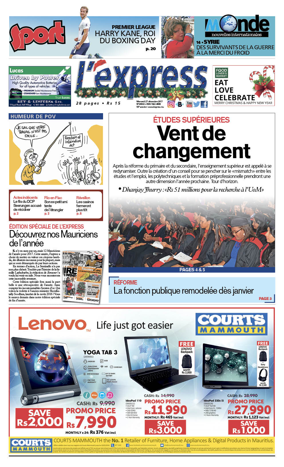 Les grands titres de l’express de ce mercredi 27 décembre
