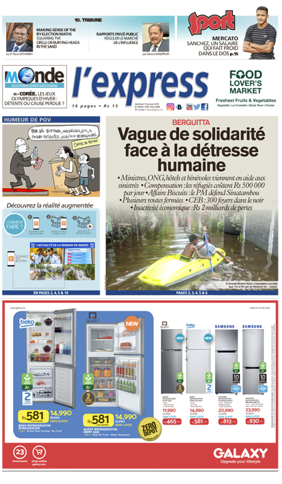 Ministres, ONG, hôtels et bénévoles viennent en aide aux sinistrés • Compensation : les réfugiés coûtent Rs 500 000 par jour • Affaire Biscuits : le PM défend Sinatambou • Plusieurs routes fermées • CEB : 300 foyers dans le noir • Inactivité économique : Rs 2 milliards de pertes