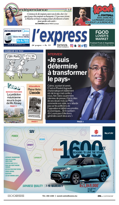 En une : «Je suis déterminé à transformer le pays», dit Pravind Jugnauth. Autres titres : La juridiction mauricienne sous la loupe de Mc Kinsey et L’exode de Plaine-Verte.