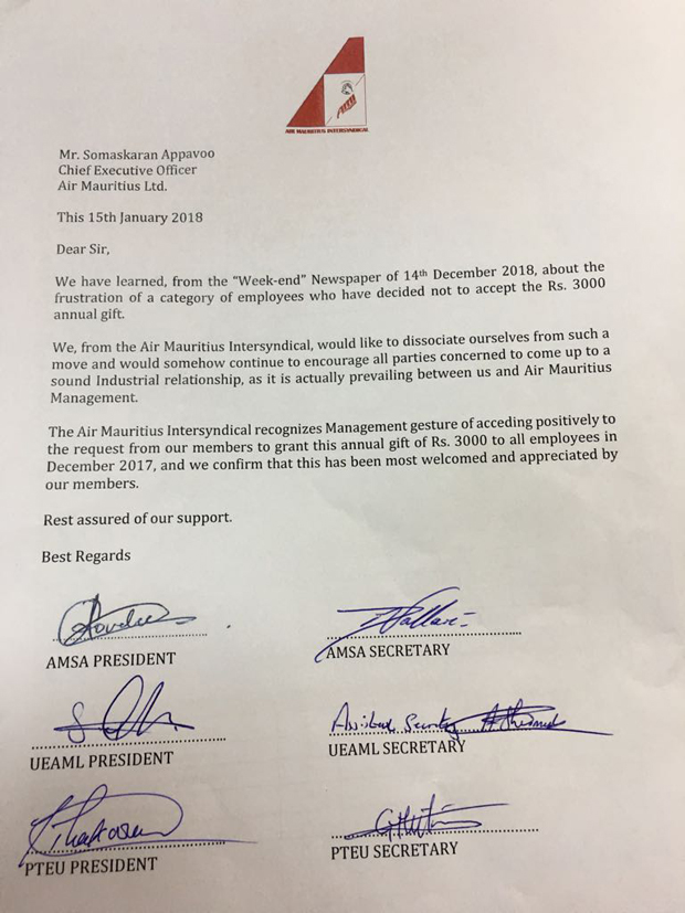 Dans la lettre, le regroupement intersyndical explique se dissocier des employés qui ont lancé un appel pour refuser les Rs 3 000. Invitant ses membres à «privilégier des relations industrielles saines» entre les salariés et la direction de la compagnie d’aviation nationale.