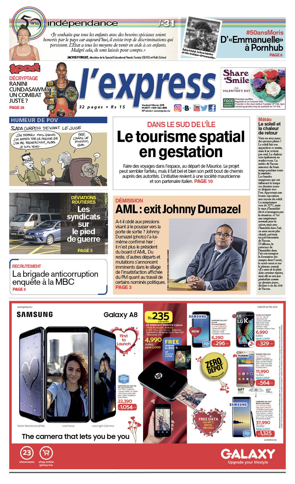 En une : Tourisme spatial en gestation. Autres titres : Dumazel n’est plus le président du board d’AML et la brigade anticorruption enquête à la MBC
