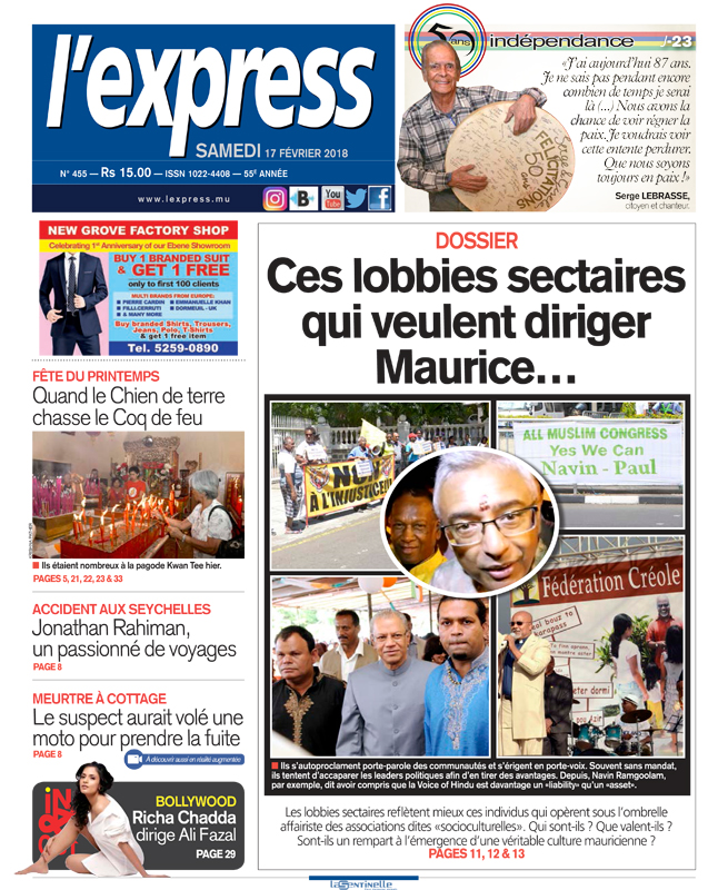 En une de l’express : ces lobbies sectaires qui veulent diriger Maurice… Autres titres : accident aux Seychelles - Jonathan Rahiman, un passionné de voyages.