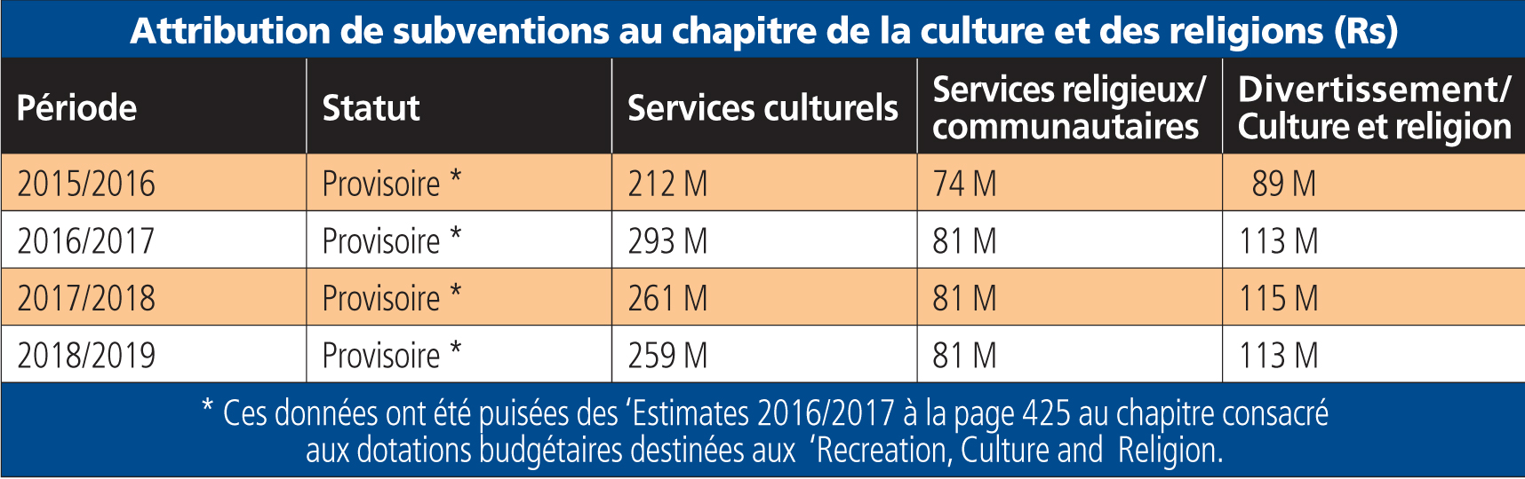 L’attribution des subventions de l’État aux religions et à la culture figure dans le Budget courant sous le libellé «Recreation, Culture and Religion». Par exemple, pour l’exercice 2017-18, une dotation de Rs 261 millions a été prévue pour financer les activités associées aux services culturels. Au chapitre des services religieux et communautaires, pour la même période, la dotation provisoire allouée est de Rs 81 millions. Les subventions destinées à la culture et à la religion sont présentées sous la rubrique «Entertainment, Culture and Religion». La dotation budgétaire pour la même période est de Rs 115 millions.