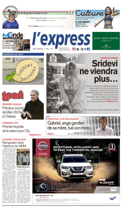 À la une: invitée le 8 mars, Sridevi ne viendra plus… Autre titre: Ramgoolam tacle l’absence du MMM au congrès travailliste.