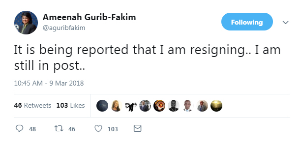 On Thursday 8 March, the president apparently asked to meet the PM as soon as possible. The PM met the president on his own on the same day at the State House and, according to Jugnauth, Ameenah Gurib-Fakim declared that “after mulling over the situation, she had decided to resign”.