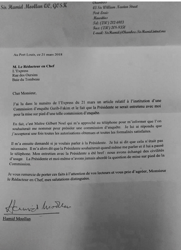 Il est inexact de dire que la présidente de la République s’est entretenue personnellement avec lui au sujet de la commission d’enquête sur les affaires Álvaro Sobrinho et Platinum Card. «La présidente et moi n’avons jamais abordé la question de la mise sur pied de la commission», précise sir Hamid Moollan, Queen’s Counsel (QC).